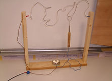 On a tortillé un fil de fer pour construire un parcours qu'on a emboité dans les tasseaux; ce parcours a été relié au circuit électrique avec la sonnette et la poignée contact (voir croquis).